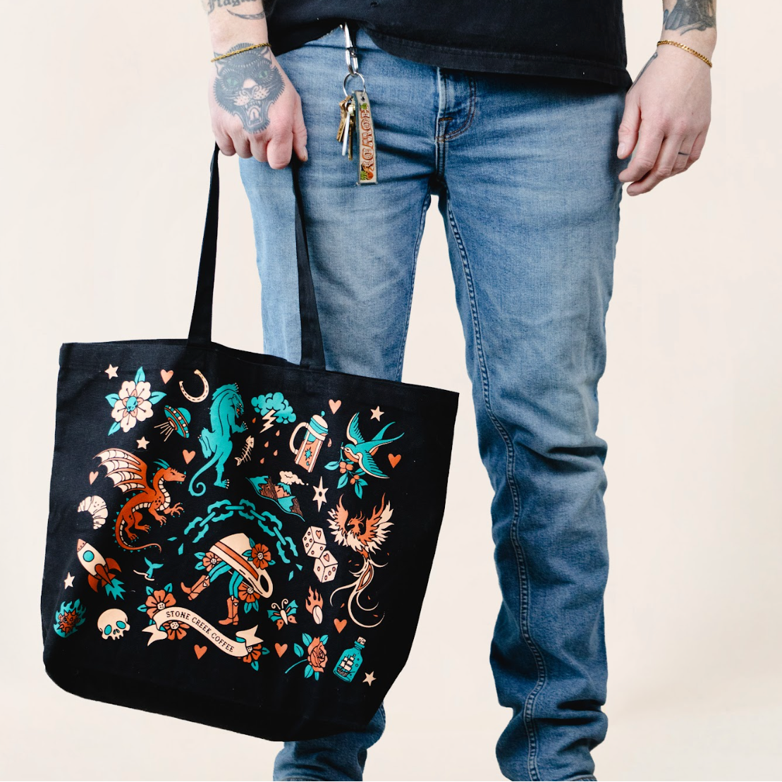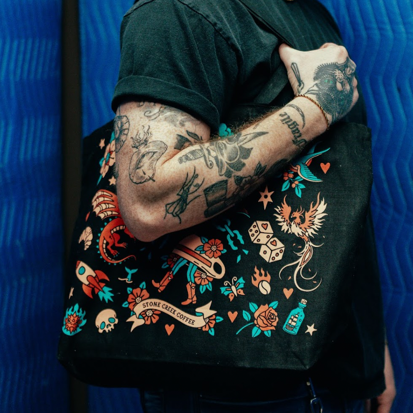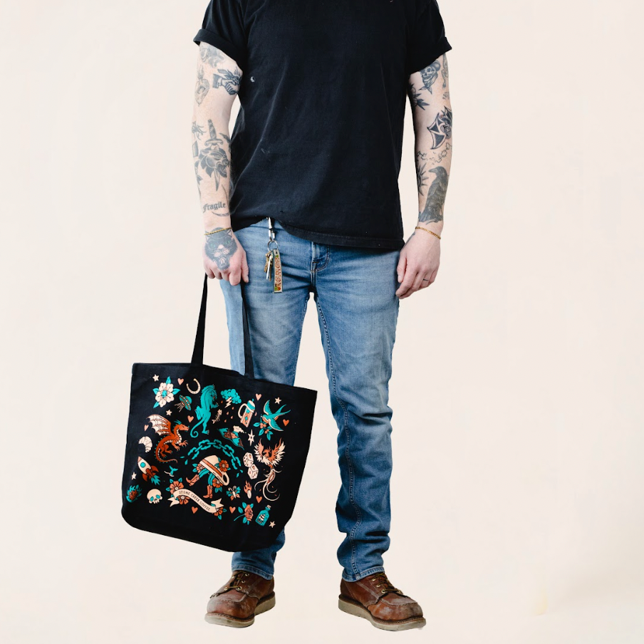 A nod to the stories we carry, the Traditional Tattoo Tote is a vessel for the everyday: coffee runs, record hauls, market mornings, whatever’s on today’s flash sheet. Inspired by traditional tattoo culture and the quiet bond between those who collect meaning in ink, this tote feels like instant membership in the tattoo club. Built to be reused, re-loved, and carried on repeat, it’s an easy swap for single-use bags, and a reminder that the best habits, like the best tattoos, are meant to last.